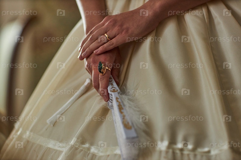 Близкий снимок леди рук, держащих кружевный вентилятор