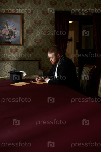 Мужчина, носящий смокинг и пишущий письмо