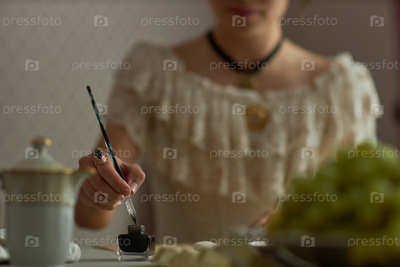 Близкий снимок женщины, погружающей ручку в чернила и пишущей письмо