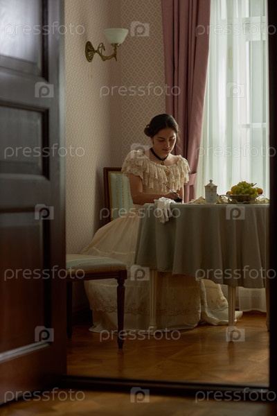 Женщина, пишущая письмо с деликатной ручкой и чернилами