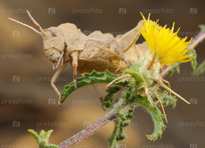 Кузнечик на желтом колючем цветке в Израиле