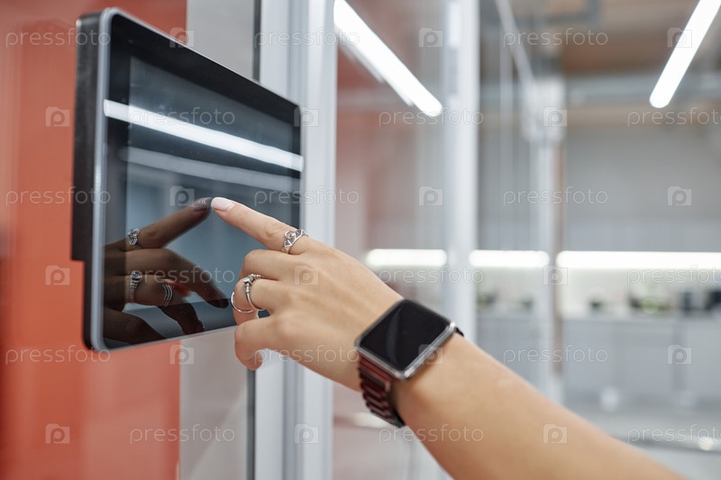 Женская рука с помощью сенсорного экрана вводит код доступа, чтобы разблокировать офисную комнату внутри