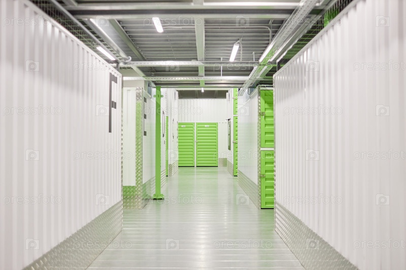 Белый проход с зелеными дверями, ведущими к самостоятельным хранилищам на складе