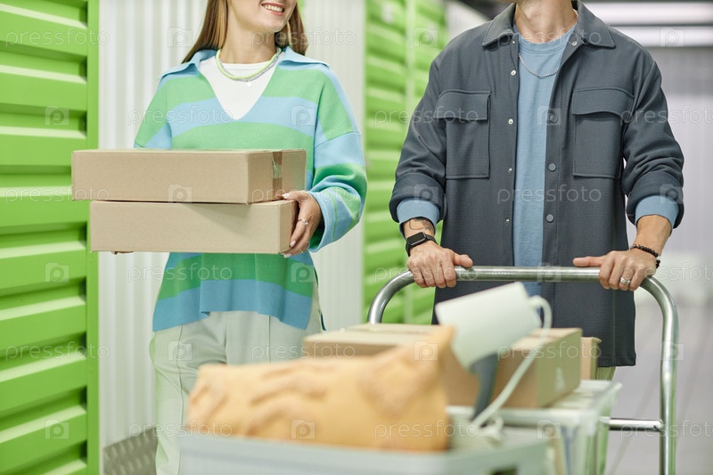 Пара транспортных ящиков на корзине в самостоятельное хранилище на складе во время переезда