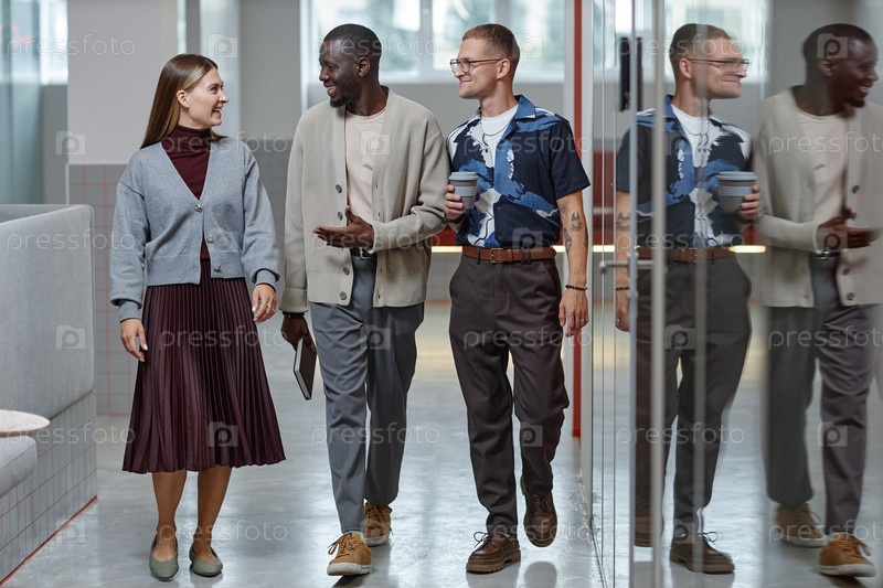 Улыбающийся чернокожий мужчина разговаривает с счастливыми сотрудниками во время прогулки по коридору бизнес-центра