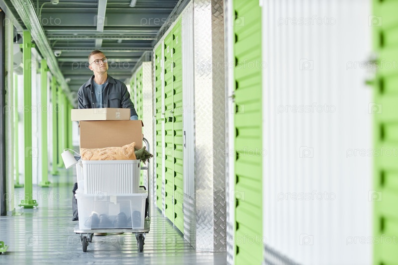 Человек, перемещающий транспортные коробки на тележке Dolly Cart в собственное хранилище на складе