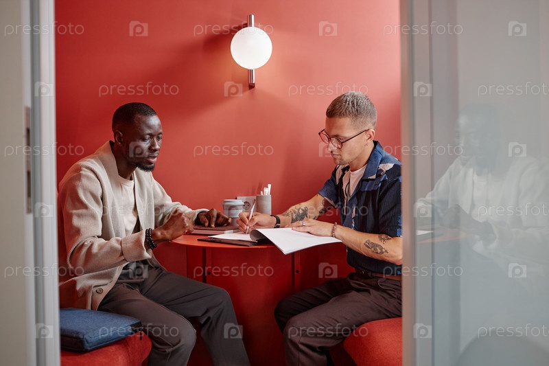 Сотрудник подписывает соглашение о работе на встрече с мужчиной рекрутером в коворкинг-пространстве Мужчина