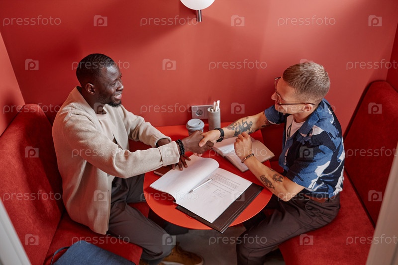 Два бизнесмена пожали друг другу руки во время подписания контракта, сидя за столом в кафе