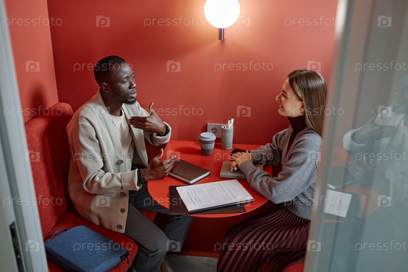 Афроамериканский бизнесмен, выступающий во время собеседования по работе с женщиной из HR, сидящей за столом в кафе