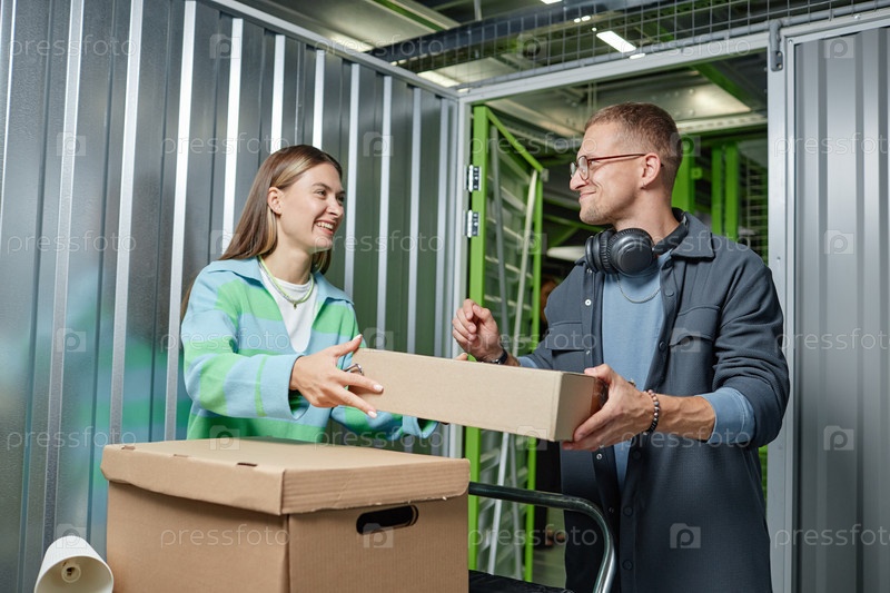 Веселая пара загружает коробки в собственное хранилище на складе во время переезда