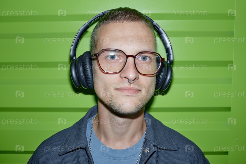 Портрет человека в наушниках, слушающего музыку на зеленой стене