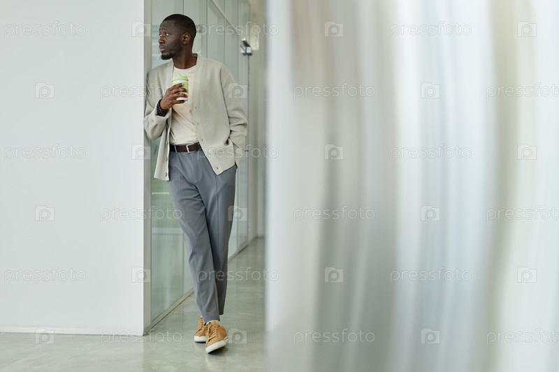 Черный мужчина в офисной одежде держит многоразовую кофейную чашку, опирающуюся на стену внутри