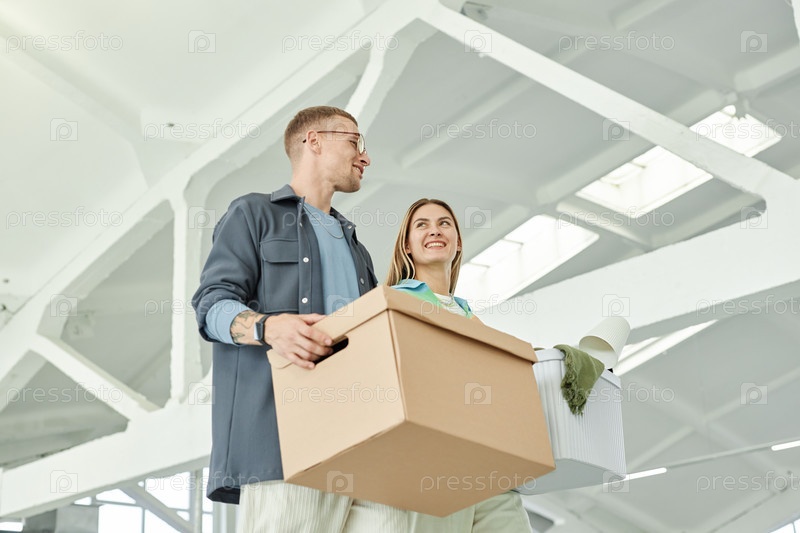Веселая женщина, несущая коробку в самостоятельное хранилище с помощью парня во время переезда