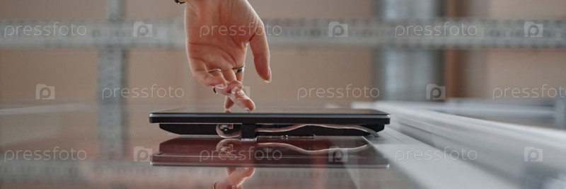 Header Image of Рука женщины, использующей сенсорный экран при вводе кода внутри дома