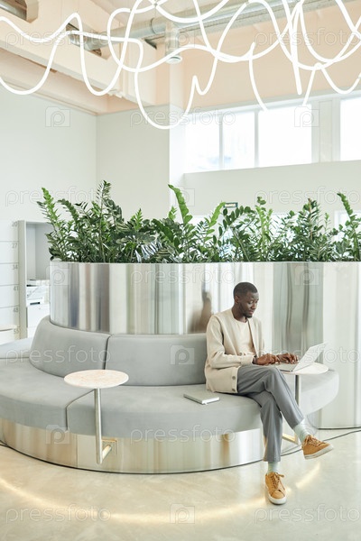 Бизнесмен сидит на диване в гостиной солнечной зоны Коворкинг с минималистическим дизайном интерьера
