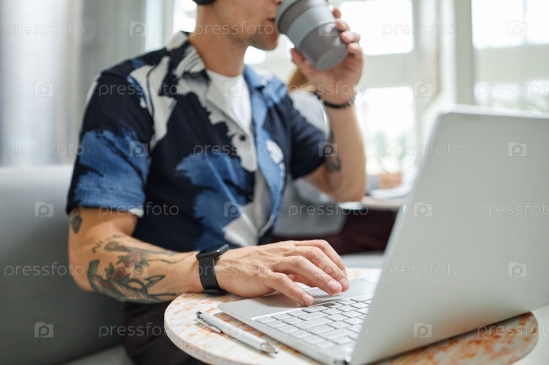 Рука бизнесмена, использующего ноутбук для работы в гостиной Область коворкинга