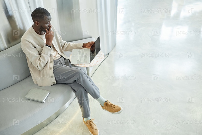 Концентрированный бизнесмен работает на ноутбуке, сидя за столом в коворкинговой зоне Lounge Zone Indoors