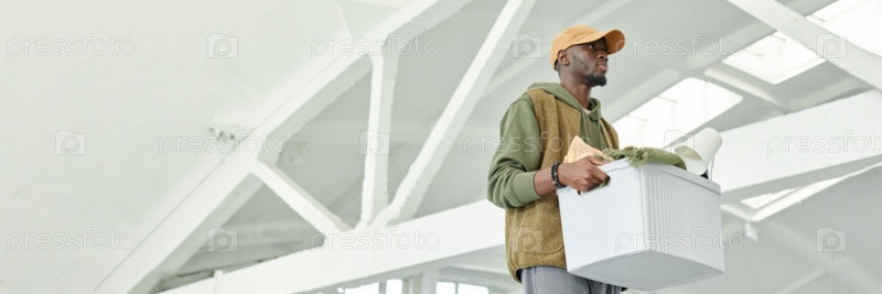 Заголовок изображения чернокожего мужчины, несущего коробку с предметами домашнего обихода в сторону собственного хранилища на складе