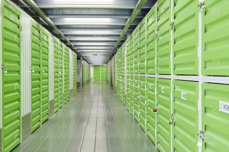 Хранилищный коридор с зелеными дверями, открывающимися в самостоятельные хранилища, защищенные замками