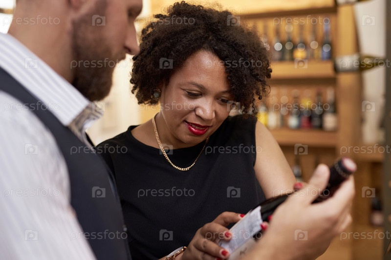 Клиент читает этикетку вина в руках сомелье
