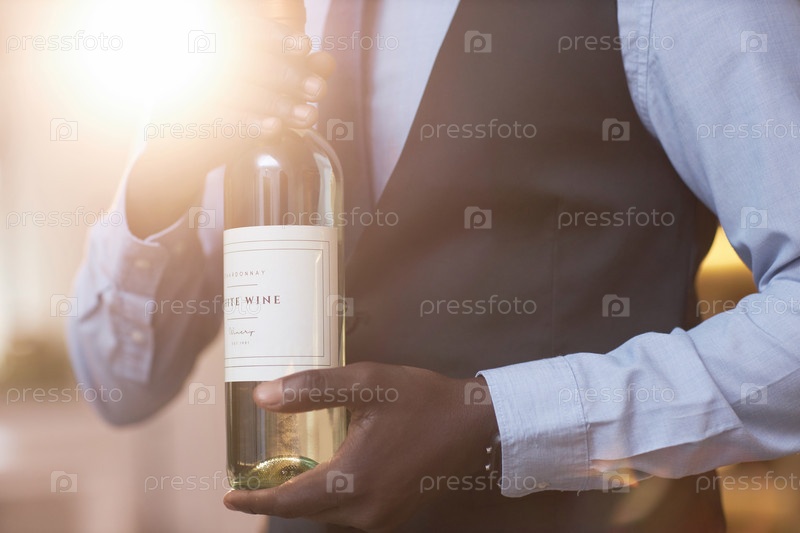 Солнечные лучи освещают бутылку с вином в мужских руках