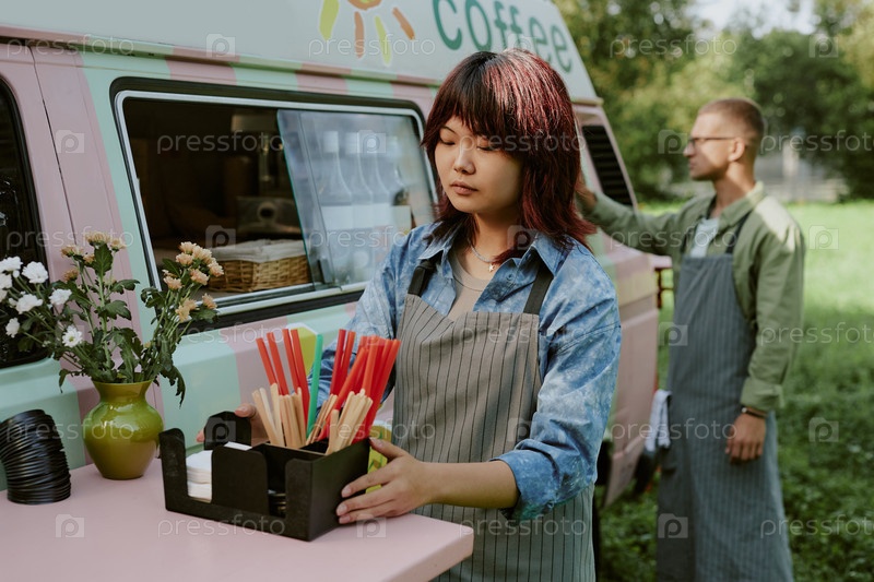 Азиатская женщина-работница, регулирующая пластиковый ящик на столе