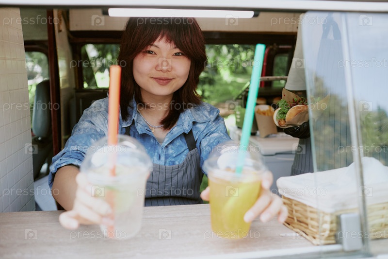 Улыбающаяся бариста с лимонадными напитками