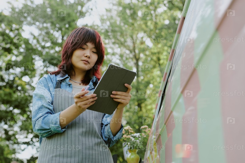 Работник пищевого грузовика читает азиатское меню