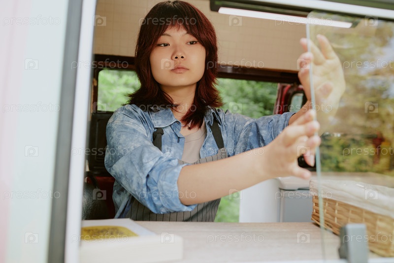 Женщина, закрывающая окно фургона