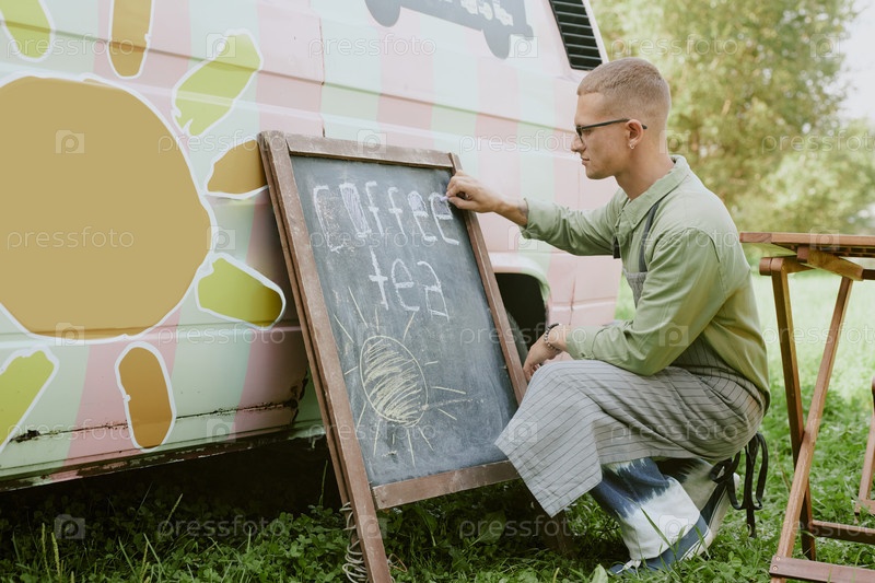 Человек, приседающий и пишущий на доске