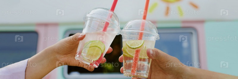 Заголовок с пластиковыми чашками с цитрусовым лимонадом