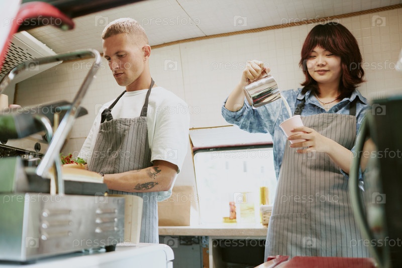 Команда молодых поваров-взрослых на кухне пищевых грузовиков