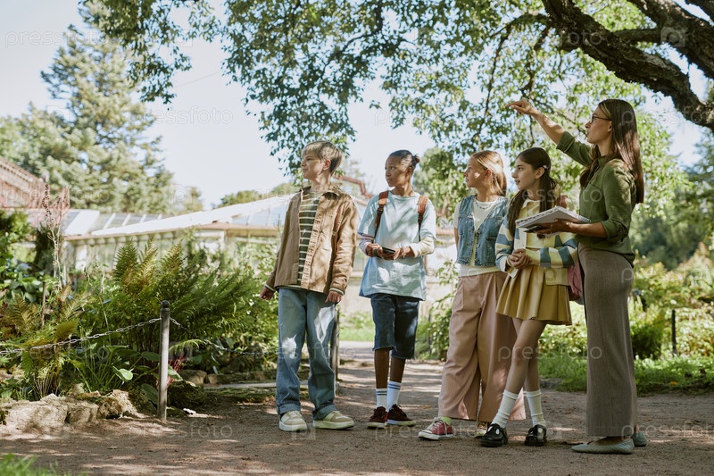 Работница ботанического сада показывает растения подросткам-студентам