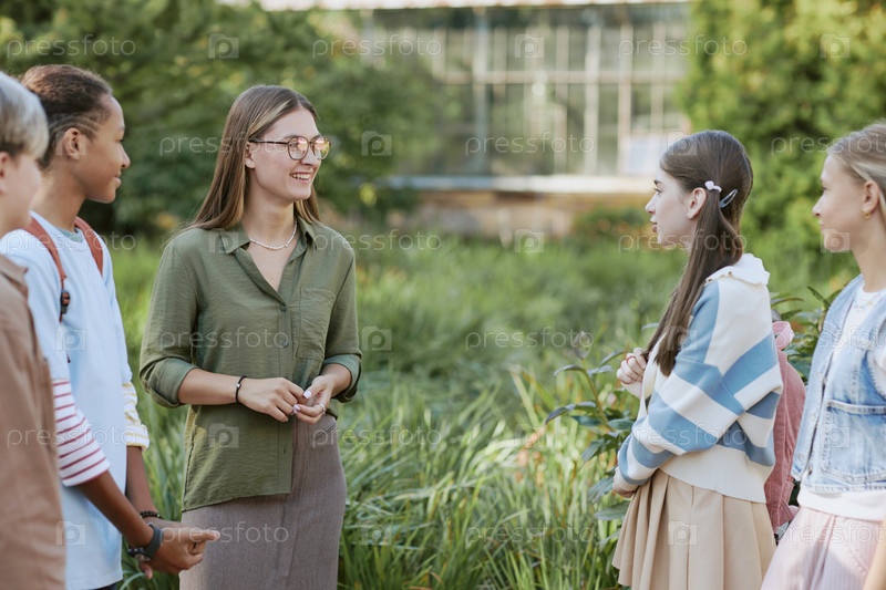 Веселый экскурсовод слушает девочку-подростка