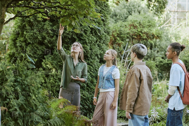 Учитель биологии показывает деревья своим ученикам во время урока на открытом воздухе