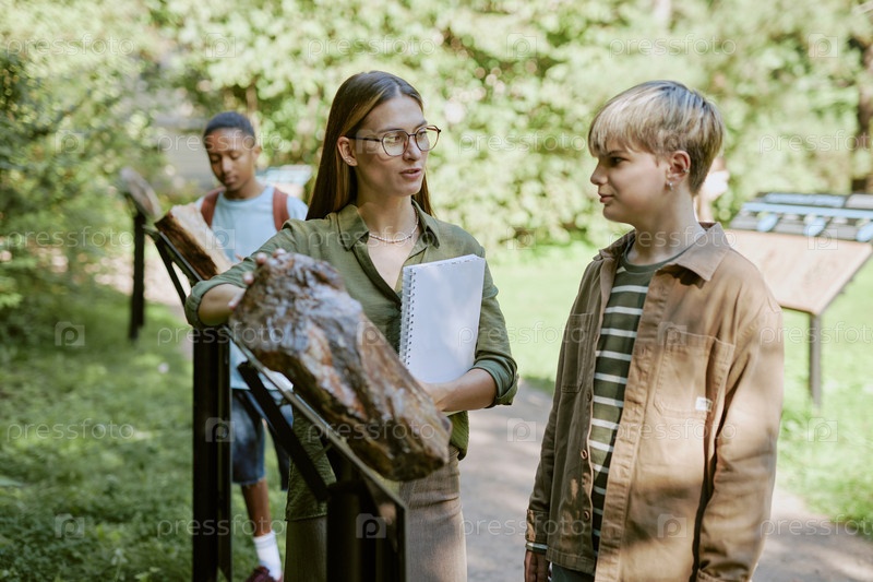 Работник ботанического сада показывает окаменелое дерево во время тура
