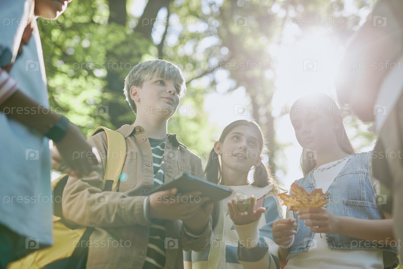 Подростки разговаривают с учителем во время урока на открытом воздухе