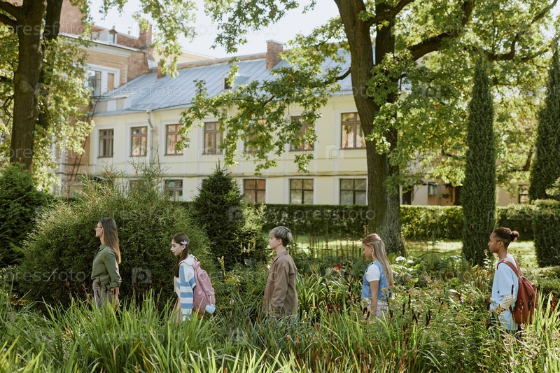 Подростки следуют за своим учителем во время урока на открытом воздухе