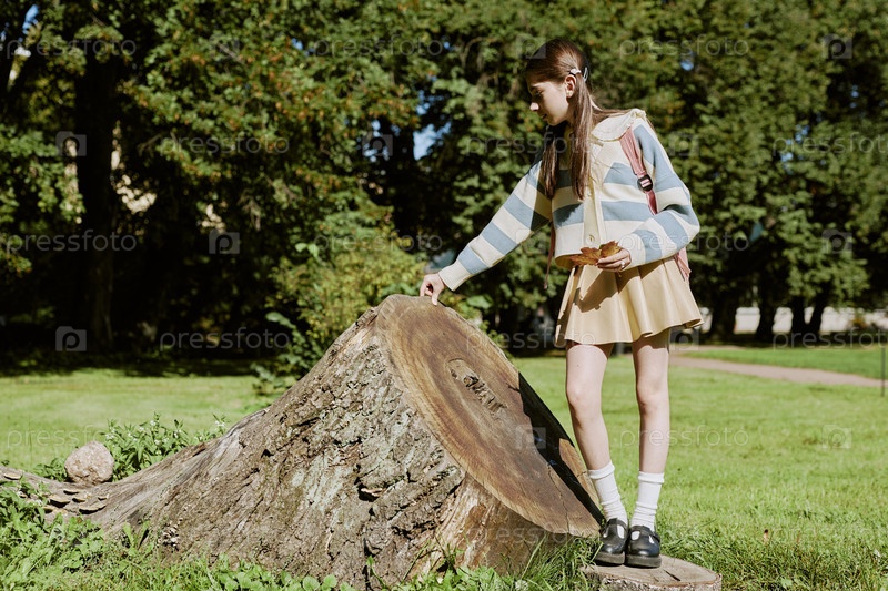 Девушка-подросток, прикасающаяся к стволу старого дерева