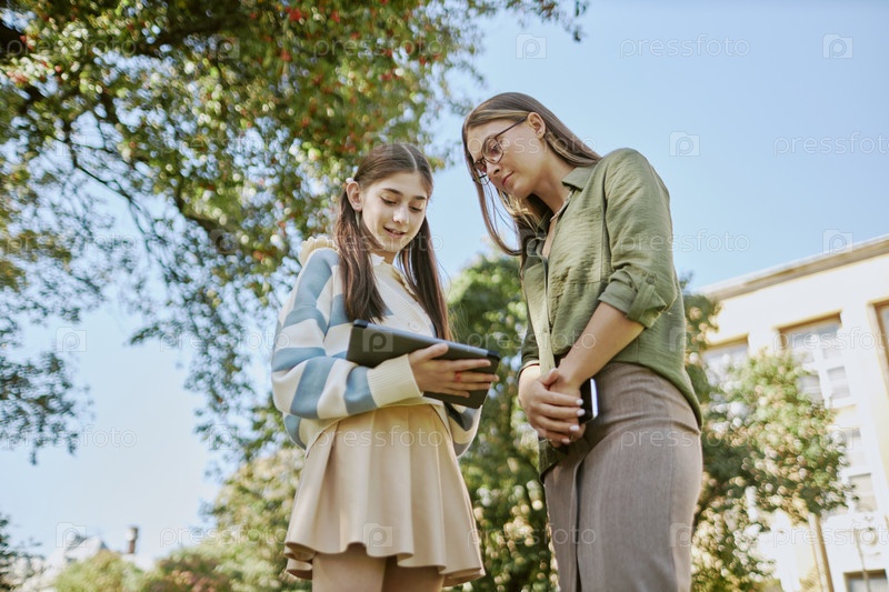 Девушка-подросток и ее учитель смотрят на экран цифрового планшета
