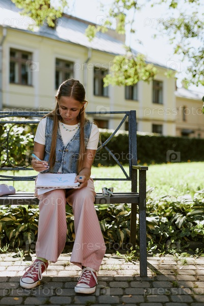 Девушка-подросток рисует эскиз на открытом воздухе