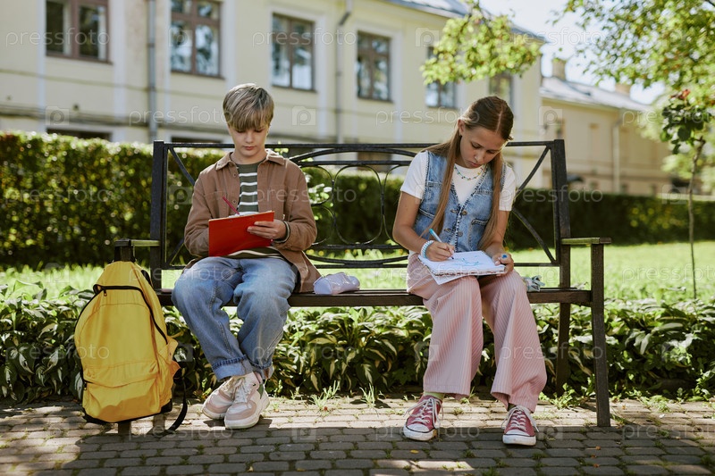 Студенты-подростки сидят на скамейке и рисуют картины