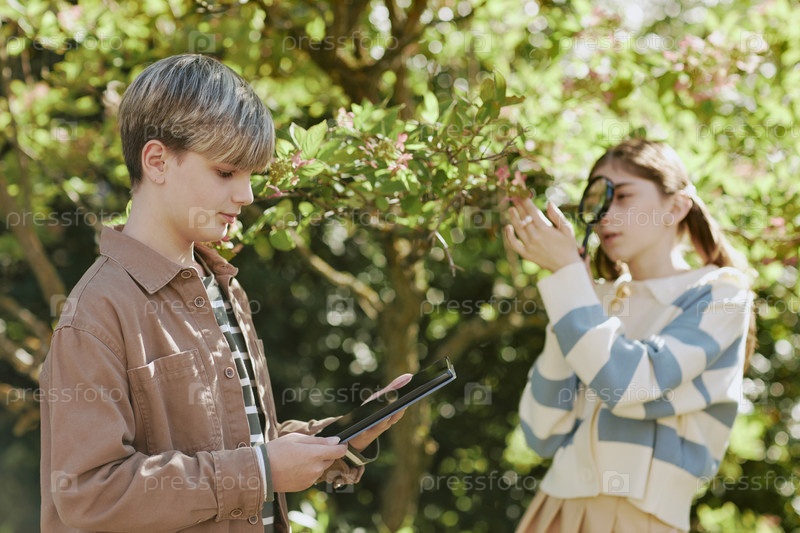 Мальчик и девочка изучают растения в местном парке