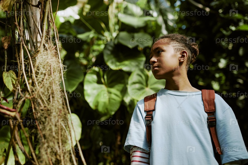 Черный мальчик проводит время в ботаническом саду