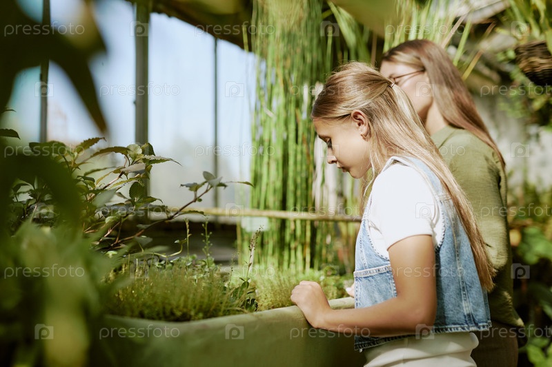 Подростковая девушка смотрит на растения в теплице