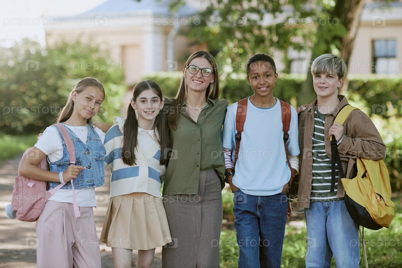 Веселая учительница и подростки в парке