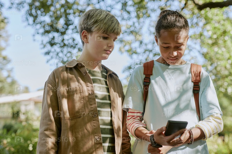 Два мальчика смотрят на экран смартфона