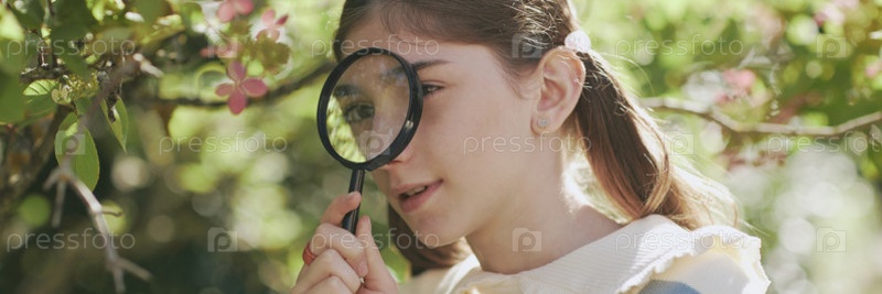 Школьница-подросток с увеличителем в ботаническом саду