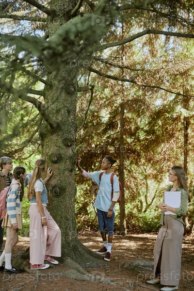 Подростки касаются старого ствола дерева во время тура в ботаническом саду