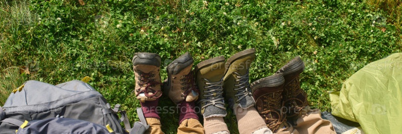 Заголовок с неузнаваемыми ногами с кемпинговыми ботинками